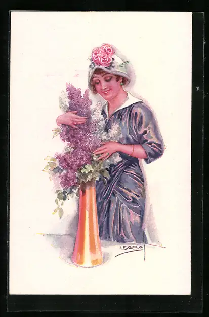 Künstler-AK Luis Usabal: Hübsche Frau an einer Vase mit Flieder