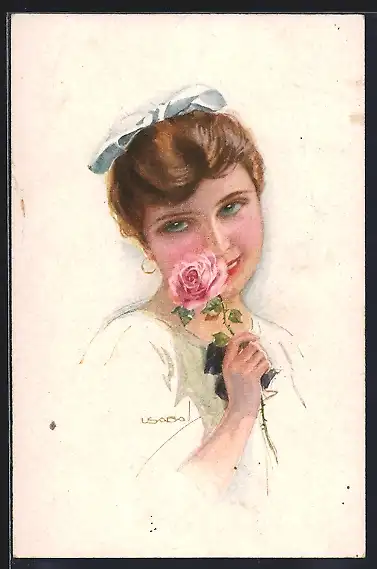 Künstler-AK Luis Usabal: Junge Dame riecht an einer Rose