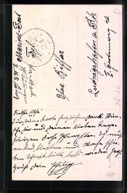 Personenbezogene Daten auf der Rückseite der Karte wurden durch blauen Textmarker unkenntlich gemacht. Die blauen Stellen sind auf die Vorderseite durchgeweicht und wirken sich negativ auf das Postkartenfoto aus