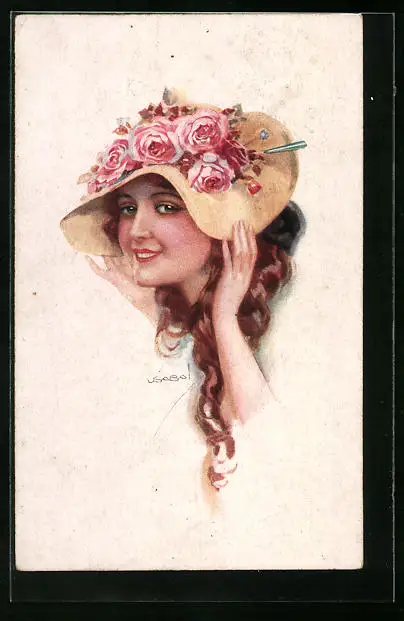 Künstler-AK Luis Usabal: Junge Frau mit Blumenhut