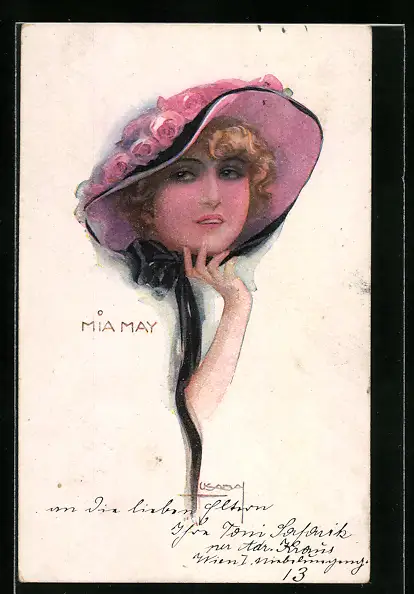 Künstler-AK Luis Usabal: Mia May, Junge Dame mit Blumenhut