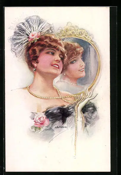 Künstler-AK Luis Usabal: Schöne Frau mit Hut an Spiegel gelehnt