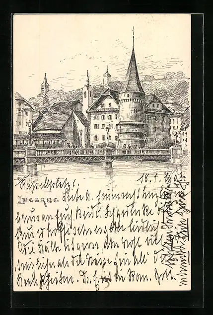 Künstler-AK Luzern, Teilansicht mit Brücke