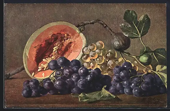 Künstler-AK M. Billing: Stilleben mit Weintrauben