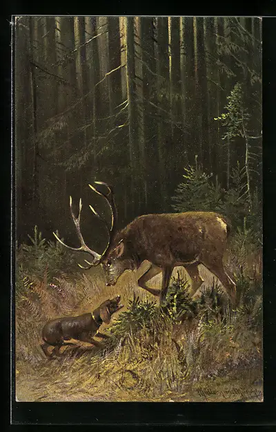 Künstler-AK M. Müller jun.: Dackel trifft Hirsch im Wald