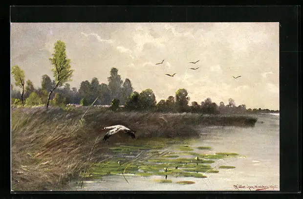 Künstler-AK M. Müller jun.: Fliegende Vögel über Wasser
