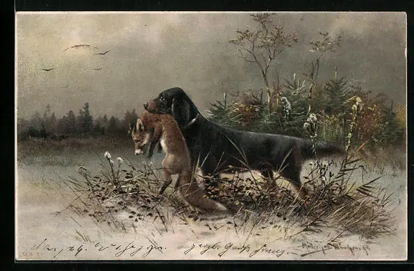 Künstler-AK M. Müller jun.: Fuchs im Maul eines Jagdhundes