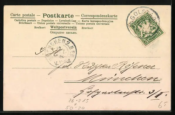 Personenbezogene Daten auf der Rückseite der Karte wurden durch blauen Textmarker unkenntlich gemacht. Die blauen Stellen sind auf die Vorderseite durchgeweicht und wirken sich negativ auf das Postkartenfoto aus