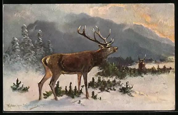 Künstler-AK M. Müller jun.: Hirsch im Schnee