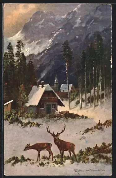 Künstler-AK M. Müller jun.: Hirsche äsen in der Nähe eines Dorfes