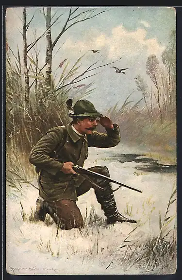 Künstler-AK M. Müller jun.: Jäger kniet in verschneiter Landschaft