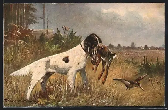 Künstler-AK M. Müller jun.: Jagdhund mit erlegtem Hasen