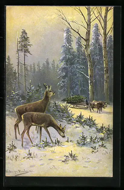 Künstler-AK M. Müller jun.: Rehe und Ochsenschlitten im winterlichen Wald