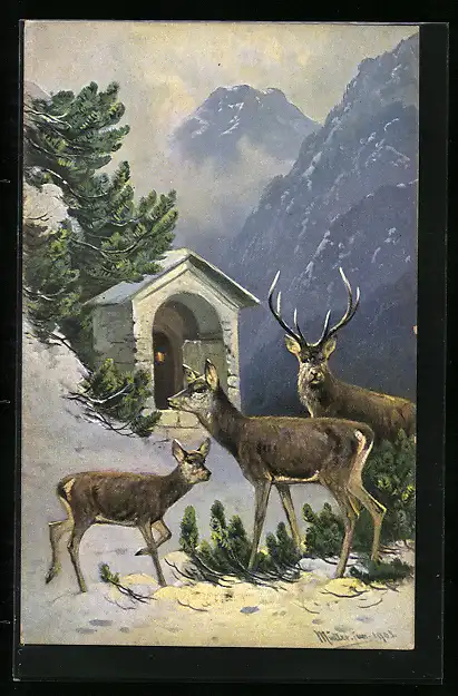Künstler-AK M. Müller jun.: Rehe vor einem kleinen Schrein