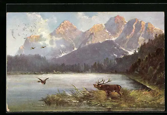 Künstler-AK M. Müller jun.: Röhrender Hirsch und Flugente am See