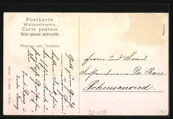 alte Ansichtskarte, gelaufen, Briefmarke entfernt, rückseitig Oberflächenschaden, guter Zustand