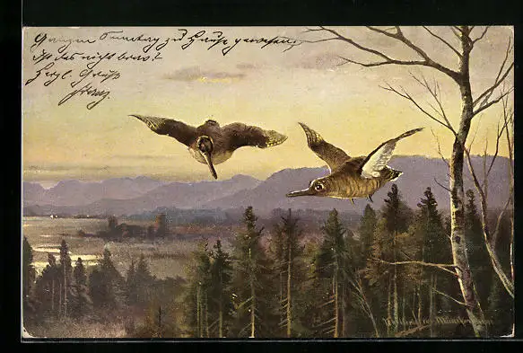 Künstler-AK M. Müller jun.: Schnepfen im Flug