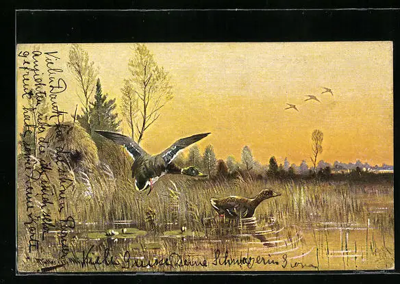 Künstler-AK M. Müller jun.: Zwei Enten beim Landen in einem Gewässer