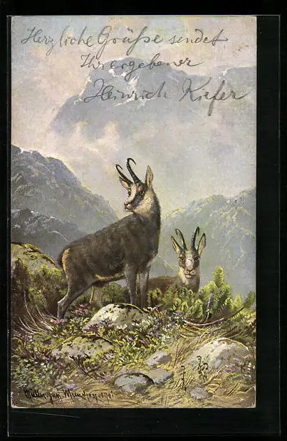Künstler-AK M. Müller jun.: Zwei Gämsen im Hochgebirge