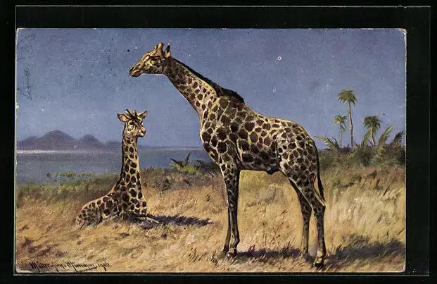 Künstler-AK M. Müller jun.: Zwei Giraffen in der Savanne