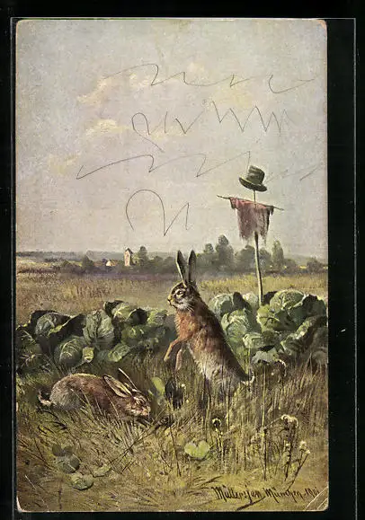 Künstler-AK M. Müller jun.: Zwei Hasen an Kohlköpfen