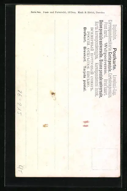 Personenbezogene Daten auf der Rückseite der Karte wurden durch blauen Textmarker unkenntlich gemacht. Die blauen Stellen sind auf die Vorderseite durchgeweicht und wirken sich negativ auf das Postkartenfoto aus