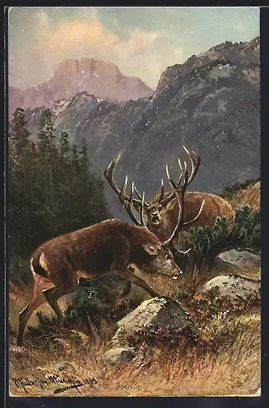 Künstler-AK M. Müller jun.: kämpfende Hirsche