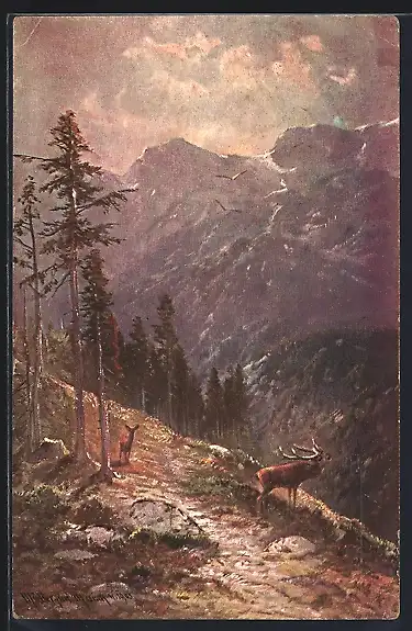 Künstler-AK M. Müller jun.: röhrender Hirsch am Abhang