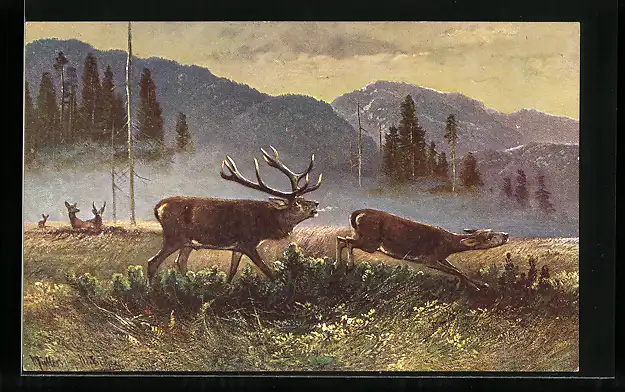 Künstler-AK M. Müller jun.: röhrender Hirsch beim Paarungsversuch