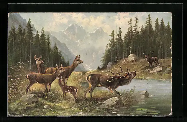 Künstler-AK M. Müller jun.: röhrender Hirsch und Hirschkühe am Wasser