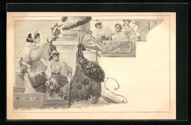 Künstler-AK M. Munk: Frauen in prachtvollen Kleidern in einer Gondel