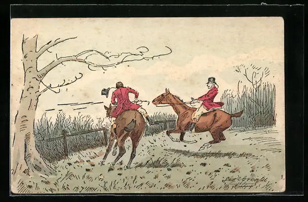 Künstler-AK M. Munk Nr. 126: Pferde einer Jagdgesellschaft scheuen vor einem Hindernis