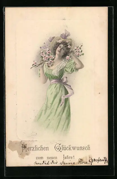Künstler-AK M. Munk Nr. 276: Hübsche junge Frau mit Hut und einem Blumenzweig