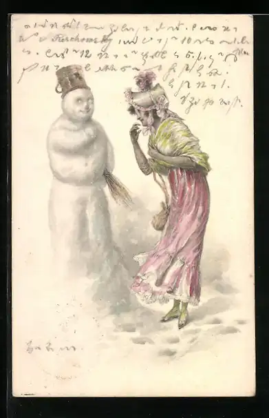 Künstler-AK M. Munk: junge Frau steht vor einem Schneemann