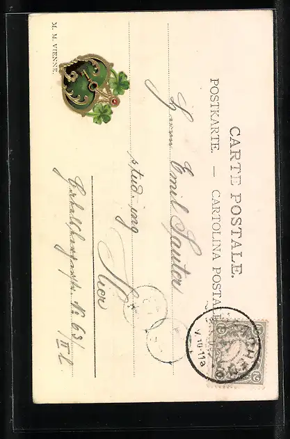 Personenbezogene Daten auf der Rückseite der Karte wurden durch blauen Textmarker unkenntlich gemacht. Die blauen Stellen sind auf die Vorderseite durchgeweicht und wirken sich negativ auf das Postkartenfoto aus