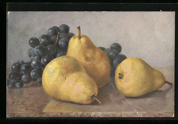 Künstler-AK M.Billing: Stilleben mit Birnen und Weintrauben