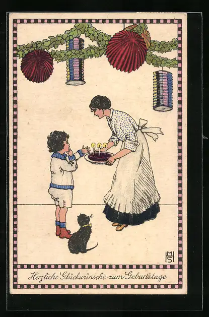 Künstler-AK M.H.S.: Mutter überrascht ihr Kind mit einem Kuchen, Katze