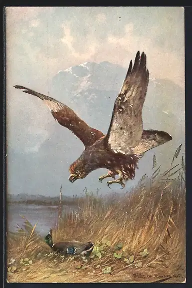 Künstler-AK M.Müller jun.: Greifvogel schnappt eine Stockente