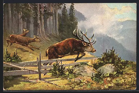 Künstler-AK M.Müller jun.: Hirsche und Rehe springen über Zaun
