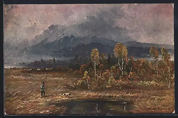 Künstler-AK M.Müller jun.: Jäger mit Hund auf der Wiese