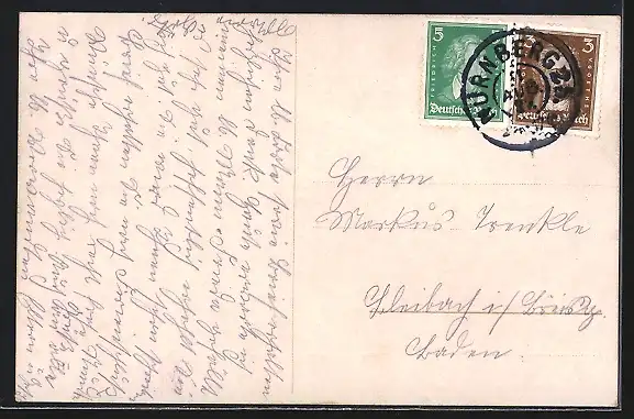 Personenbezogene Daten auf der Rückseite der Karte wurden durch blauen Textmarker unkenntlich gemacht. Die blauen Stellen sind auf die Vorderseite durchgeweicht und wirken sich negativ auf das Postkartenfoto aus