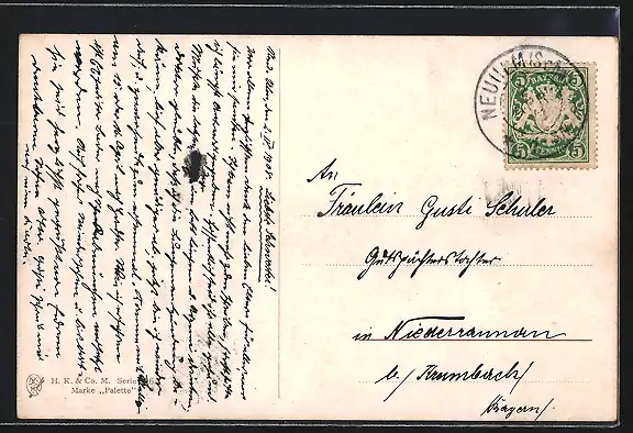 Personenbezogene Daten auf der Rückseite der Karte wurden durch blauen Textmarker unkenntlich gemacht. Die blauen Stellen sind auf die Vorderseite durchgeweicht und wirken sich negativ auf das Postkartenfoto aus