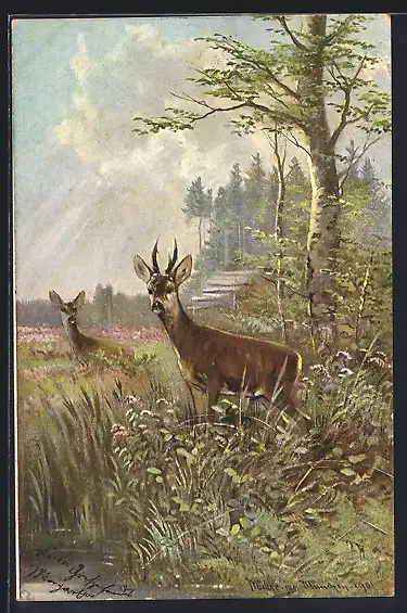 Künstler-AK M.Müller jun.: Rehe am Waldesrand