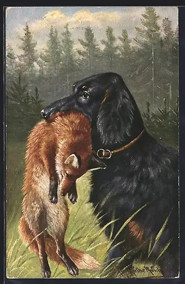 Künstler-AK M.Müller jun.: Setter mit Fuchs im Maul