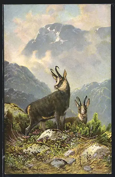 Künstler-AK M.Müller jun.: Steinböcke am Berghang