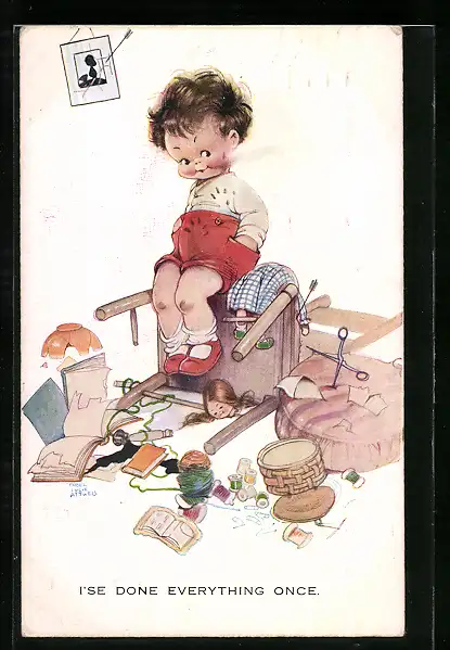 Künstler-AK Mabel Lucie Attwell: Kleines Kind sitzt in Mitten von Chaos