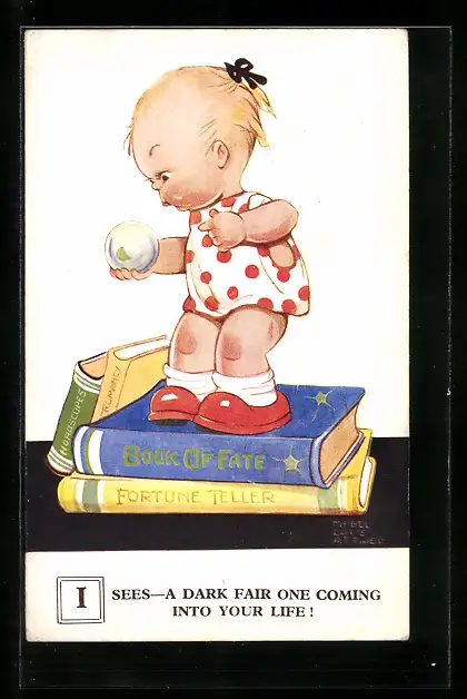 Künstler-AK Mabel Lucie Attwell: Kleines Mädchen mit Ball auf Büchern