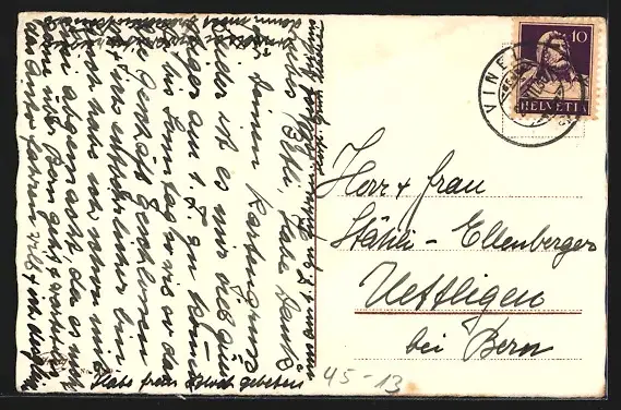 Personenbezogene Daten auf der Rückseite der Karte wurden durch blauen Textmarker unkenntlich gemacht. Die blauen Stellen sind auf die Vorderseite durchgeweicht und wirken sich negativ auf das Postkartenfoto aus