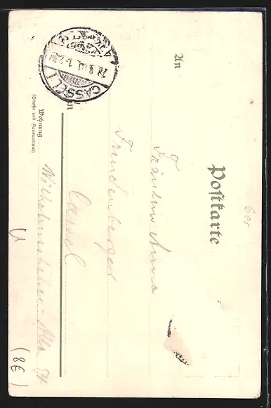 gelaufen 1901, Briefmarke entfernt, rückseitig Oberflächenschaden, Bugspur li. mittig, Stecknadelloch li. oben, Eckknick re. oben, guter Zustand