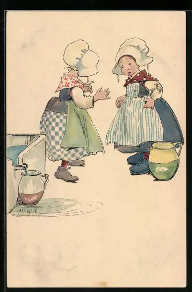 Künstler-AK Mädchen in niederländischen Trachten beim Wasserholen